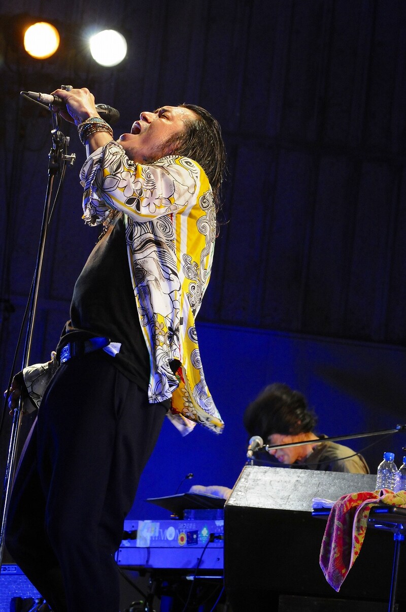 7月25日にリリースしたニューアルバム「Kind of Mind」収録曲をメインにした前半は、立て続けに演奏した「独り善がりのアウトローより」からの4曲で真っ赤なライトに照れされながら、鬼気迫る姿で吠えるように歌って客席を圧倒。お馴染みの曲を歌った後半は、感極まったのか「がんばれがんばれ」を歌い終わった後にしばらく後ろを向いたままになるという、彼としては珍しい一幕もあった。