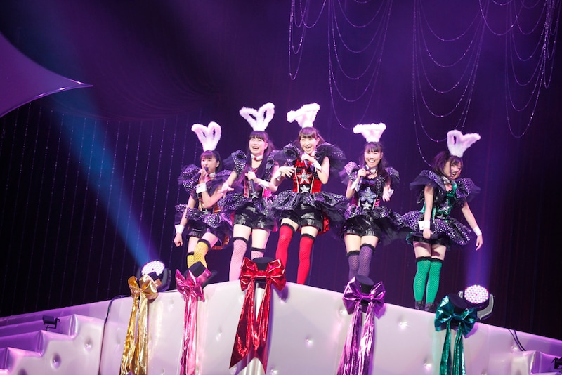 ステージに姿を現したももクロは、バニーガールをイメージした衣装を初披露。ミニスカートとニーハイソックスに、大きなウサ耳と尻尾が特徴的な5人は冒頭から「ミライボウル」「ピンキージョーンズ」「ココ☆ナツ」といった、アップテンポな人気ナンバーをパワフルに歌い上げた。