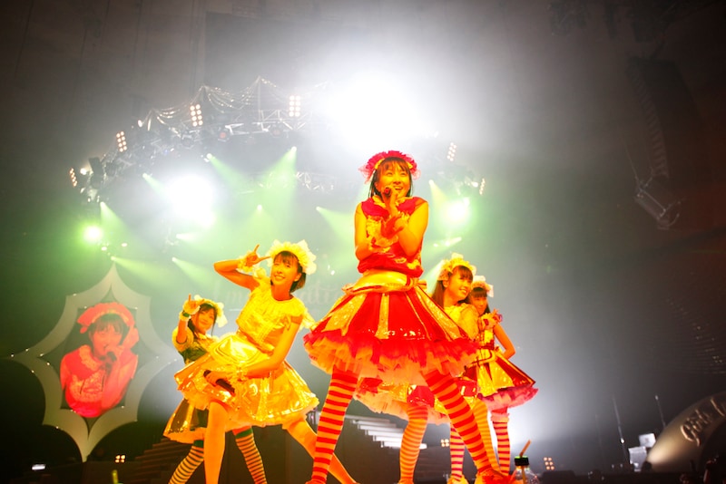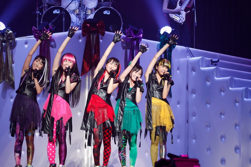 ここで一旦退場したメンバーに代わり登場したのは、ギター、ベース、ドラムからなる女性バンド。「行くぜっ!怪盗少女」のサビなどを織り交ぜながら、ロックビートを刻んでいく。「ズッキュンズッキュンズッキュン」というコールを客席に定着させると、衣装をチェンジしたメンバーが登場。ノースリーブのライダースジャケットにメンバーカラーの付け毛というロックな出で立ちで、バンド演奏とともに「BIONIC CHERRY」をパフォーマンスした。