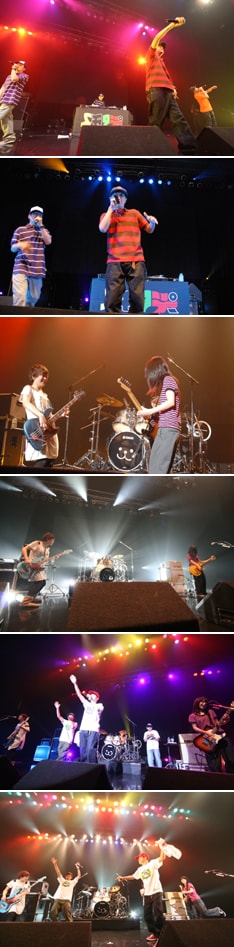 先攻で登場したのはスチャダラパー。DJ・SHINCOが鳴らす「DAI-KOUBUTSU」に乗って登場したANI、BOSE、そしてロボ宙の3人は「MORE FUN-KEY WORD」「BD発言」「CHECK THE WORD」といったナンバーでフロアを盛り上げる。あまりにもファン層がかぶらない組み合わせゆえにメンバーも不安だったのか、途中のMCではBOSEが「今日はお客のスジがいい!よかった。こういう感じじゃなかったら途中で(曲順の)路線変更しようって言ってたんだよ(笑)」と話し、双方のファンを大いに笑わせた。