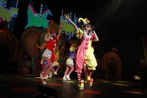 初の武道館公演という記念すべきステージのコンセプトは「武道館を飛び出す絵本にしよう!」。それを表すように、ステージ上にはサーカスに見立てたパネルが背面に置かれ、開演前から場内にはオルゴールの音色が流れていた。そのオルゴール音のボリュームが徐々に大きくなり、いよいよ開演。きゃりーはイントロチューン「ぱみゅぱみゅレボリューション」に乗せて、花道先端のポップアップから「イエーイ!」と元気良く登場した。