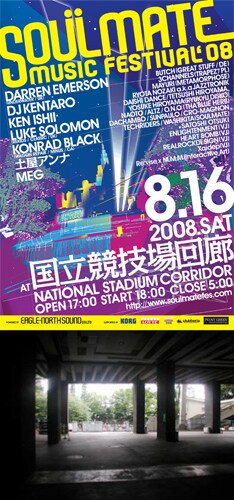 「SOULMATE MUSIC FESTIVAL'08」は都心のど真ん中、国立競技場の回廊走路で行われるオールナイトの都市型音楽イベント。ヘッドライナーのDARREN EMERSONを筆頭に、dj KENTARO、