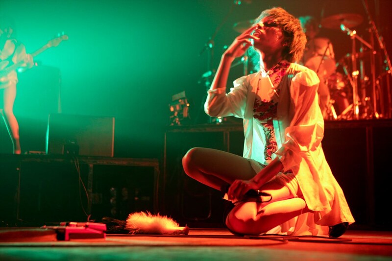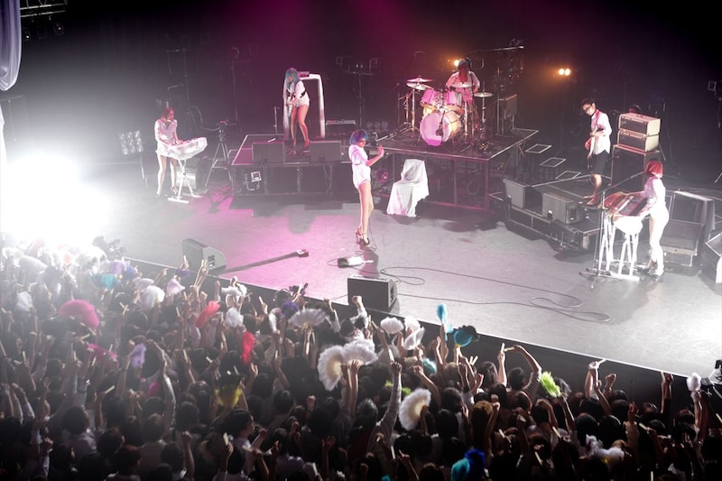 このライブではドレスコードとして“白”が設けられ、フロアはそれぞれ白いアイテムを身につけた超満員のファンで真っ白に染め上げられた。開演時刻を迎え幕が開くと、やしちゃん(B)、ルリちゃん(Dr)、サポートギターの長岡亮介、そしてサポートキーボードの2人の5人がステージに。この5人による「夜曲」の演奏でライブがスタートし、ルリちゃんの「白兵戦」という言葉に続いてアヴちゃん(Vo)が登場した。白いシャツに白いショーツというシンプルかつ大胆なコスチュームで「鏡」「イミテヰション」「デスコ」と、強力なナンバーをノンストップで次々と披露。会場はすさまじい熱気に包まれた。