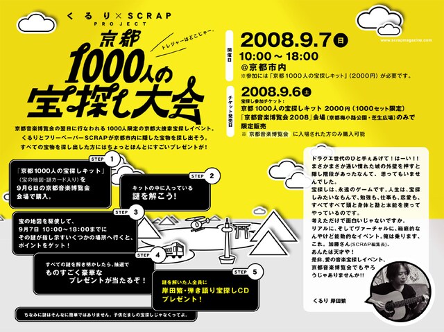 くるり主催のライブイベント「京都音楽博覧会 2008 IN 梅小路公園」の翌日となる9月7日、京都市内にて連動企画「京都 1000人の宝探し大会」が開催される。