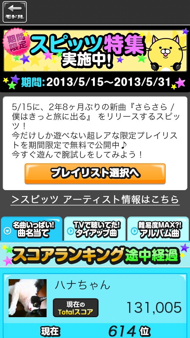 「うたあて」はダウンロード数70万を超える人気イントロクイズアプリで、対戦モードも楽しめる。スピッツ特集は本日5月15日より5月31日まで行われており、期間中はスピッツのプレイリストを無料でプレイできる。