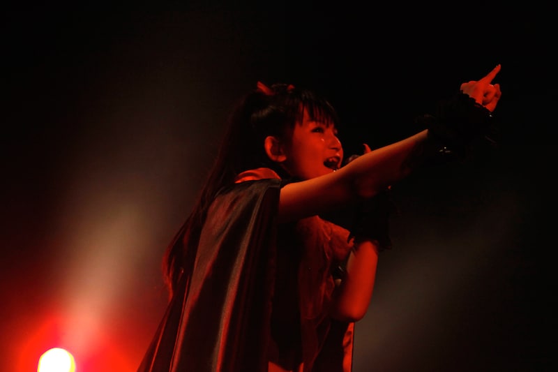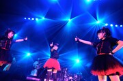 一旦ステージを去るメンバーと入れ替わるように現れたキツネ面のバイオリン奏者が、メタルの神バンドとともにショパンのピアノ曲「革命」のヘヴィメタルアレンジをプレイしたのちには、YUIMETALとMOAMETALのユニット、BLACK BABYMETALがフードを目深にかぶって登場。6月19日リリースの2ndシングル「メギツネ」のカップリング曲であるラップチューン「おねだり大作戦」を披露すると、今度はマントをまとったSU-METALの姿が。同じく「メギツネ」のカップリングとなるソロ曲「紅月 -アカツキ-」をマントを翻しながらエモーショナルに歌い上げたのち、YUIMETALとMOAMETALと再合流して「ド・キ・ド・キ☆モーニング」を叩き込んだ。