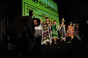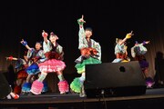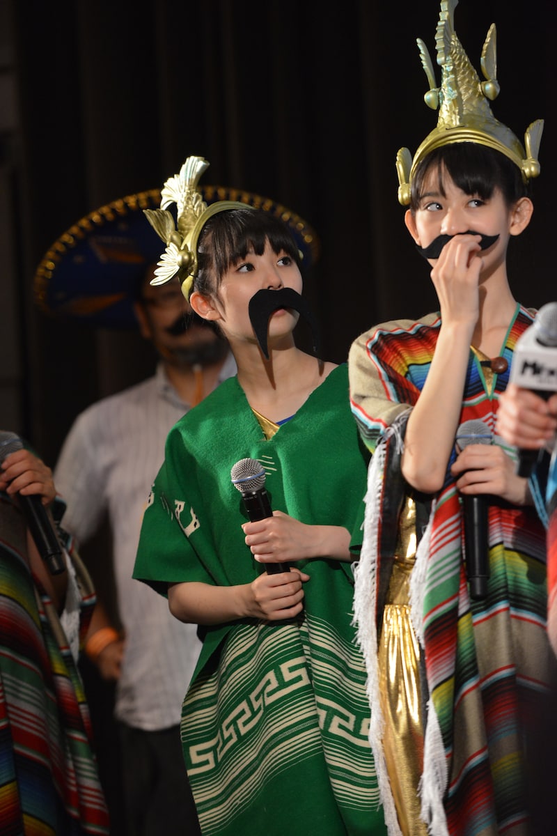 ところが今回のチャート発表は、これだけでは収まらない。突然メキシカンな格好をした女性と、その通訳を名乗る男性がステージへと上がり込む。いわく今回のシングルはメキシコのiTunes Storeチャートでも1位を獲得したとのことで、画面を確認すると確かに1位の座に。このスペイン語でまくしたてる女性は「メキシコ放送のクラウディアさん」。クラウディアはお祝いに持参したポンチョをメンバーに着せ、一緒に「アリーバ!(バンザイ、がんばれ、さらに上昇せよなどの意)」と叫んだ。ちなみにチームしゃちほこが所属するレーベル「unBORDE」は、メキシコの公用語であるスペイン語で「境界線」などを表す言葉で、彼女たちの楽曲「お願い!unBORDE」はスパニッシュサウンドを取り入れた楽曲。6人はお祝いにポンチョ姿で「お願い!unBORDE」を歌い、この場をしめくくった。