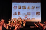 そして後半は「ワールドプレミアムPV試写会」と、気になるiTunes Storeのチャート発表へ。「首都移転計画」のPVはメンバーも完成版を観ておらず、ファンと同じタイミングで初めて観ることに。PVは手描きの書き割りなどを使ったチープな演出と、モニターを多用したトリッキーな仕掛けが同居した斬新な仕上がりで、上映会にはこのPVの監督を務めたスミスも登壇した。スミスは氣志團やフジファブリック、マキシマム ザ ホルモンら邦楽アーティストのPVを多く手がける映像作家。今作について聞かれると「チームしゃちほこの限界に早くも挑戦した感じ」「ロボットダンスは観どころがハンパない。あそこだけで20回は観られます」と自信のほどを覗かせた。秋本がインベーダーゲームのような動きをするシーンは、本人には何を撮影するのか知らされていなかったようで「ここで足踏みをしといてって言われただけ」だったと舞台裏のエピソードを告白。会場に足を運べなかった人は公開を楽しみにしておこう。