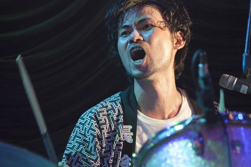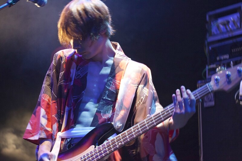 20分の休憩を経て始まった第2部は、「お祭り」をテーマに展開。リクエストで1位から10位に選ばれた楽曲を下から順に披露していくセットリストに加え、メンバーが着物や法被姿でステージに立ち、ビジュアル面でも観客を楽しませる。なお第2部の冒頭では法被姿のケーサクが和太鼓の腕前を披露するパフォーマンスも行われ、会場を震わせる力強いリズムと華麗なバチさばきに大きな拍手が送られた。緩やかMCを挟んでいた第1部から一転して、第2部はほとんど休みなくストイックに楽曲を連発していった3人。「キネマBABYは、夏祭りBABYですか?」という煽りから始まり、床が大きく揺れた「レイジー・ベイビー」、ワタルがギターを置きハンドマイクで歌い上げた「ビート・クラブ」、ヤスのひずんだベースが刺激的に響いた「ギンガムの街」などが会場を彩っていく。人気曲ばかりとあって、イントロが鳴るたびに大きな歓声が沸き、ときには「キャー!」という興奮気味の悲鳴が起こることも。リクエスト第3位の「バクチ・ダンサー」と、第2位の「修羅」はメンバーのプレイも前のめりになり、激しいアンサンブルがフロアに叩き付けられた。そして「気になる第1位だよ」というワタルのひと言から始まったのはライブの定番として愛されている「S.O.S.O」。サポートの白澤修(G)も巻き込みながらメンバーは轟音を鳴らした。