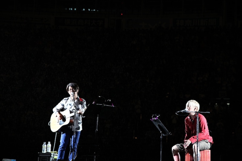 第2部は、アリーナエリア後方に設営されたミニステージに後藤が現れたところからスタートした。彼は弾き語りで「ひかり」をじっくり歌い上げ、東日本大震災直後に作った同曲への思いを語る。「この曲はオロオロしてる当時の思いが出てて、パッケージしておいてよかったなって。自分を戒める思いもあって」と述べ、続けて「夜を越えて」を披露した。さらに「僕のベストフレンド」という紹介とともにシークレットゲストのナカヤマシンペイ(Dr)を呼び込む。後藤とナカヤマは約10年前に“楽屋で暗い組”だったエピソードを語り、「下北のライブハウスで一番暗かった2人がピッチャーマウンドに立ってるんだよ。夢があるよね」と笑い合った。2人はギターの弾き語りとカホンというミニマムな編成で「転がる岩、君に朝が降る」をプレイ。途中でにわか雨が降る一幕もあり、アコースティックセッションに彩りを添えた。