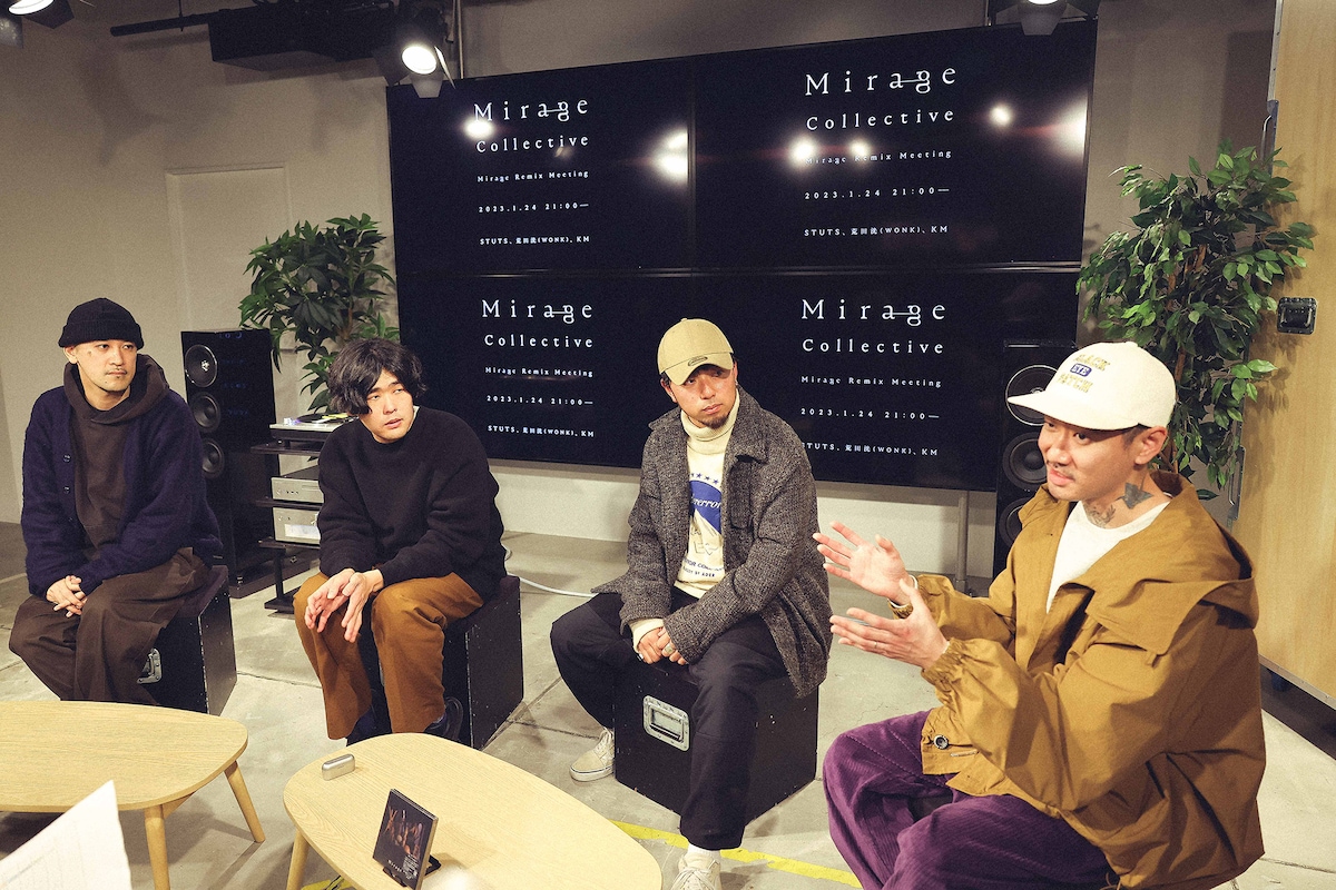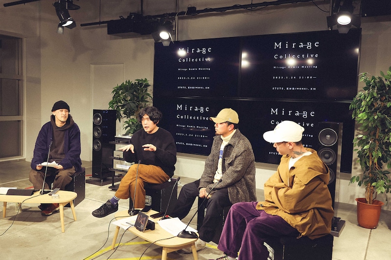 事前の選考会でSTUTS、荒田、KM、shakkeの厳正な審査を勝ち抜いたのは、poivre、Rytl、Joint Beauty、slowstoop、Co Klout$、Cacao、水溶性豆苗、imkohe、タミノス、ruco、KC(ミナミノツドイ)、Noli Stark、ryutaro murata、Whoopiの14組。「Mirage Remix Meeting」では、出演メンバーがその1曲1曲に真剣に耳を傾けながら、推薦理由や改めて音源を試聴した感想を語り合っていく。音源の試聴中には、4人が制作者それぞれの多彩なアプローチに驚き、「この人はクラブで酒も飲まずにストイックに踊ってそう」とその生活を想像しながらリミックスを楽しむ姿も見られた。またSTUTSはリミックスを聴く際の基準について、「わかりやすく『おっ!』と思うのはクオリティですよね。あとは原曲のどの部分を使っているのか、どういう趣旨のリミックスなのかはチェックします。最初に気になるのはそこなんですけど、最終的には全体の印象がいいかどうか。案外クオリティが高くなくても面白い作品はあるから、そういうのも含めてリミックスの面白さだと思います」と説明していた。