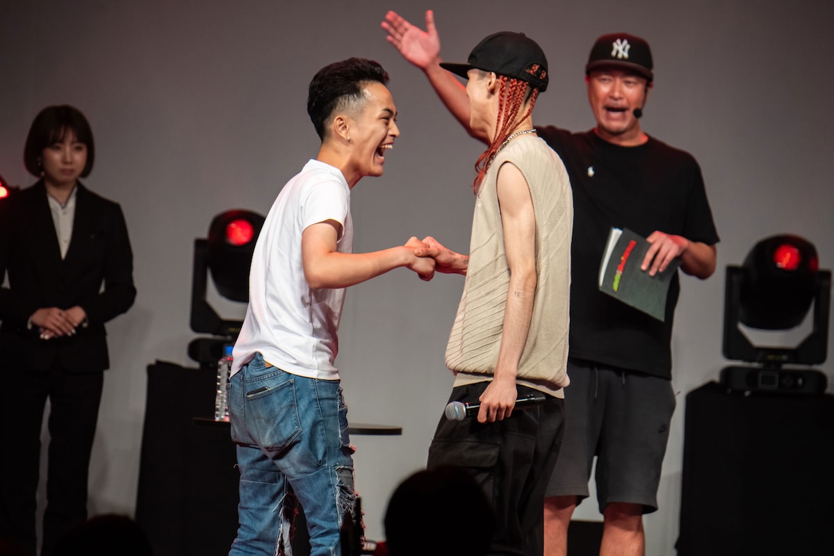 そして、これを皮切りにバトルは壮絶なフロウ合戦にシフトチェンジ。そのうえで両者ともにクリティカルなワードも巧みに忍ばせていく高度な戦いが行われ、FORK審査員が「今日の中で一番レベルの高い試合。もう1回やったら結果は変わると思う」と複雑な心境を明かすほどの甲乙つけがたい名勝負に。結果はL.B.R.Lの勝ち抜けとなり、熱戦を終えた2人は満面の笑みを浮かべて互いの手を握りあった。