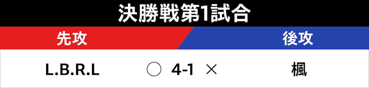 まず先攻のL.B.R.Lが「自分からディスなんて吐いてねえ」「誰かを下げることをしてラップをしたいわけじゃねえ」とスタンス表明のテーマを仕掛けると、楓は「いつまできれい事を並べるつもりだ」と返し、第2回大会の結果を踏まえて「2度も決勝で負けるなんてうんざりだよ」と貪欲に勝ちに行く姿勢を見せる。これを受けて「一生人ばっかディスってっから決勝で負けんじゃねえの?」とのアンサーで切りつけたL.B.R.Lは、さらに「こういう真剣な目だよ」を契機に「俺は信玄武田か上杉謙信くらいブレずに前進してるぜ」とふんだんに韻を盛り込んでフロアの喝采を呼んだ。この武将シリーズを受けて楓も「織田信長」をリリックに混ぜ込むなど対抗したが、審査員の票はL.B.R.Lに傾く結果となった。