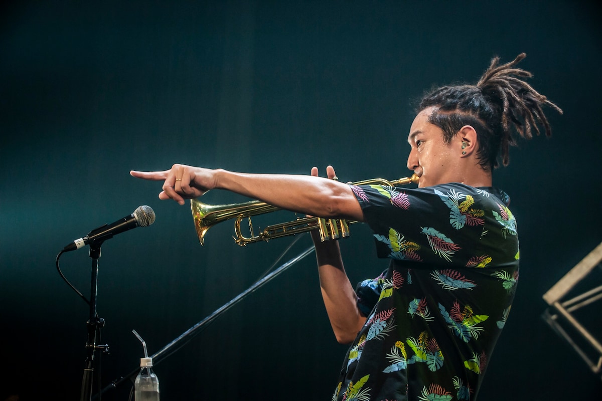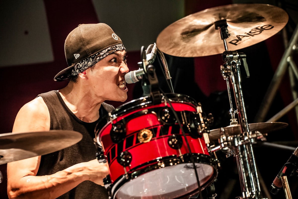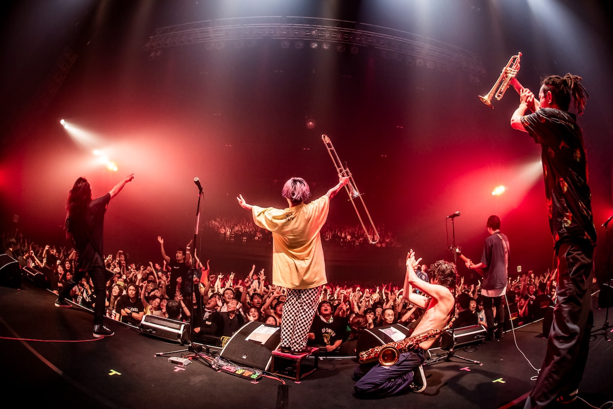 ここで改めてHEY-SMITHの遍歴を紹介しよう。2006年に大阪を拠点に活動を始めたHEY-SMITHは、2015年にオリジナルメンバーが2人脱退し、同年7月にかなす、YUJI(Vo, B)、イイカワケン(Tp)を迎えた現体制となった。旧体制の時点で、バンドの知名度と人気を一気に押し上げた2ndフルアルバム「Free Your Mind」をリリースし、今やパンクシーンの1つの象徴になったHEY-SMITH、SiM、coldrainによるスプリットツアー「TRIPLE AXE」もスタートしており、野外での「HAZIKETEMAZARE FESTIVAL」も行われていた。人気、実力ともにシーンのトップにいながらのメンバーチェンジ、しかもツインボーカルのうちの1人が変わるという、大きな変革だった。メンバーの脱退は2015年2月に発表されたものの、前年9月に行われた「HAZIKETEMAZARE FESTIVAL」以降はライブがなく、事実上の活動休止状態にあったことも伴い、ファンは当時大きな不安を抱えていたことだろう。そんな中、彼らは再始動する際、欠けたメンバーの穴を埋めるどころか、人数を増やし、2管から3管へとパワーアップして戻ってきた。当時、猪狩は「メンバーが半分変わって、しかもボーカルが変わって成功してる日本のバンドって俺は見たことがないんですよ。だからまだ誰もやってないウルトラCを決めてやりたい気持ちもあります」と語っていた(参照:HEY-SMITH「STOP THE WAR」インタビュー)。HEY-SMITHとは、そういうバンドなのだ。「いろんな波乱とか問題があったとしても、それを乗り越えるだけ」。しかも、乗り越えるときにはより強くなってくる。