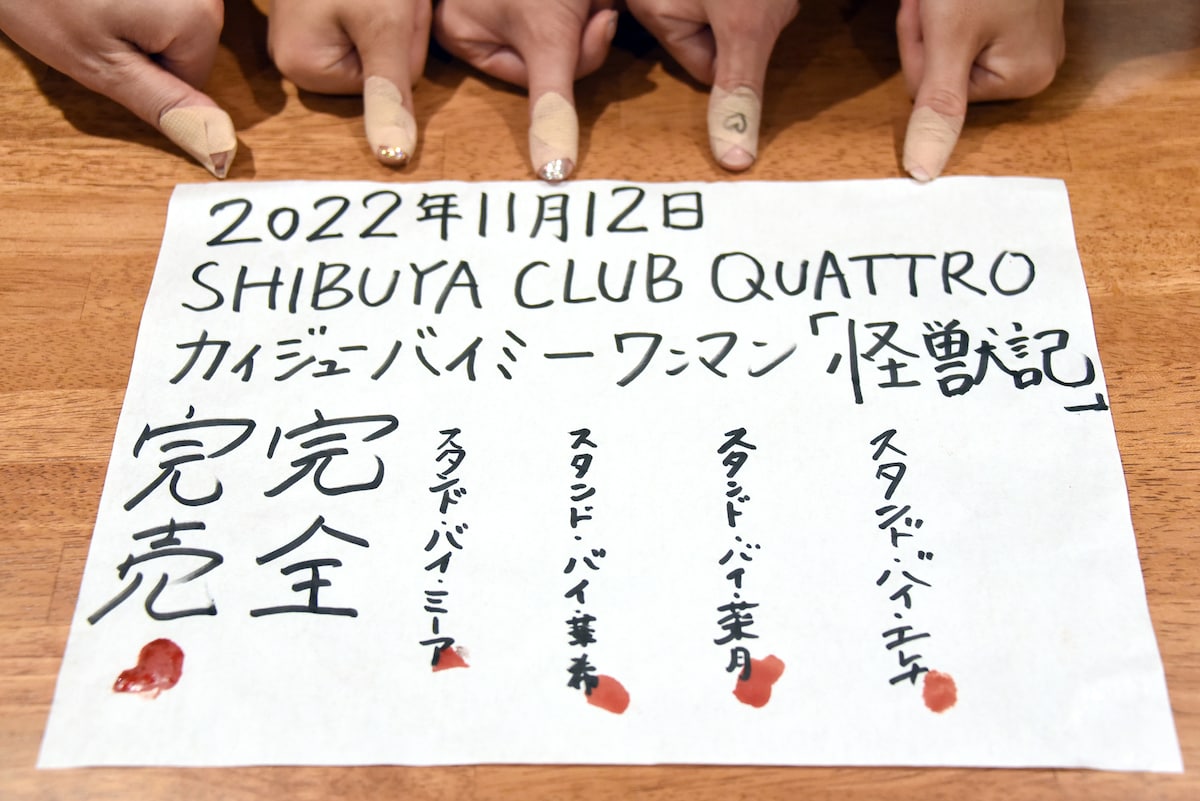 祐 今までこの4人には、少なくともカイジューバイミーとしては、なんとなくで夢や目標を口にしてほしくなかったという思いがあって。メンバー自身もその思いを近くで感じてくれていて、目標を明言してこなかったんです。だって、ステージで叶えたい夢って、1人で達成できないものがほとんどじゃないですか。応援してくれるファンや心配してくれる家族がいて、実際のところ、僕も自分の夢のためにたくさんの人を道連れにしてきました。それは、自分のエゴに“夢”って名前を付けて、人を巻き添えにするということなんです。だからこそ、その覚悟を持った者が口にした夢から、ドラマや感動が生まれるんじゃないかとも思っていて。今回、メンバーが初めて「この会場を埋めたい」と言ってくれたんですよ。「これが夢だ」って。11月12日に渋谷クアトロでワンマンを開催するにあたり、今日は僕らの覚悟を伝えるべくこの場に来ました。ただ、血判状という形で、しかもそれに自分も参加することになるとは思いもしませんでした(笑)。