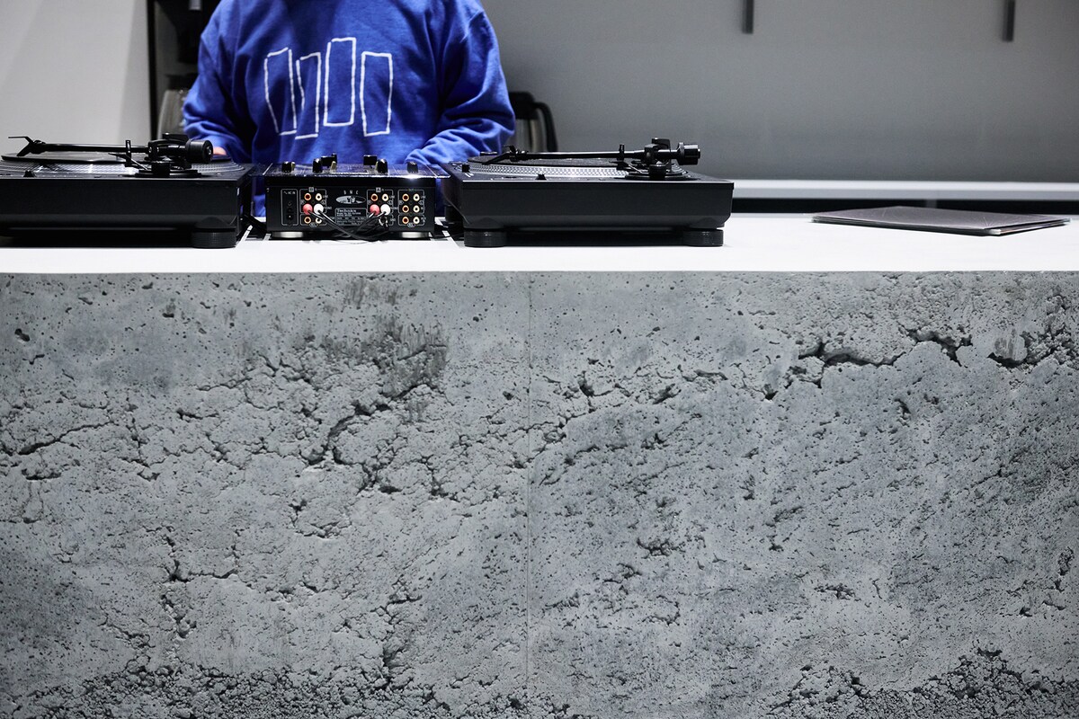 普段は床も壁も仕上げるんですけど、このビルは新築なので、その新品という状態に対して、わかりやすく線引きして「うちはこれしかやってません」というのを明確に示した設計になっているんです。こだわったポイントとしては手数を入れてる部分が非常に少ないことで、それはコンクリートの塊で作ったカウンターとベンチ、床を実際に切って作った円形の3つ。手数が少ない分、そこに対しての情報量を増やすことを意識しました。例えばカウンターとベンチは、本来であればコンクリート特有のツルツルした質感になっているべきなんですよ。でもTechnics café KYOTOではコンクリートにあえて気泡がたくさん入った、チョコレートが溶けたようなテクスチャーを取り入れました。建築の世界ではNGなのですが、失敗作をあえて作らせることで情報としての強さを入れているんです。