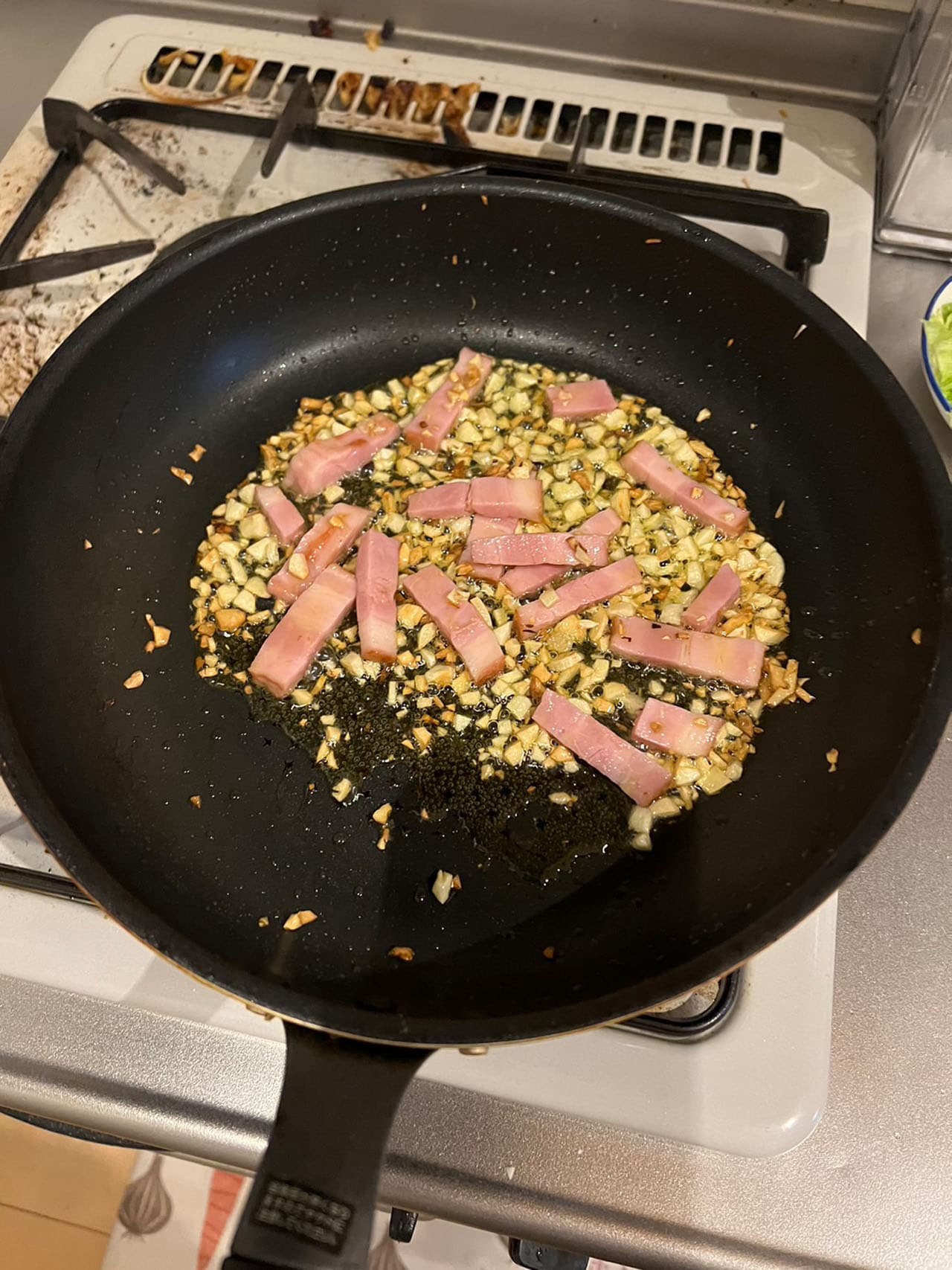 - フライパンにオリーブオイルをひいて、にんにくを炒める。