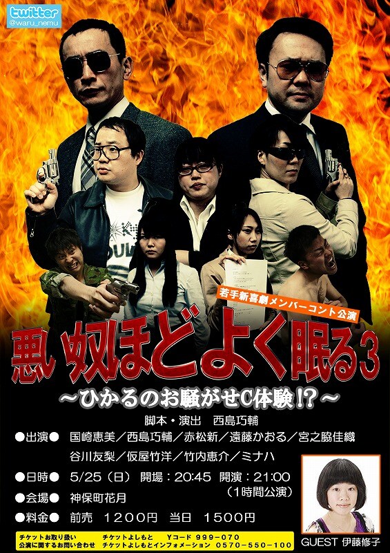 今年2014年2月に上演された第2回公演では、ルミネの新喜劇でも共演経験のあったポテト少年団がゲスト出演。会場も満席となり、好評を博した。今回は、舞台やドラマでの活躍はもちろんのこと、「ダイナマイト関西2014」でいち早く決勝進出を決め、芸人に負けない大喜利力を見せつけた伊藤修子がゲスト出演。同公演のオフィシャルTwitterには、日々の稽古の様子なども掲載されている。