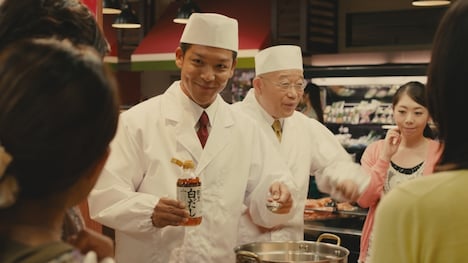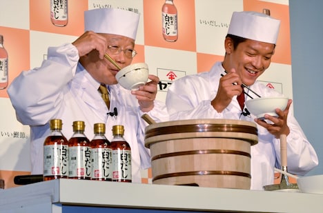 ヤマキ「めんつゆ」のCMに続き、俳優でミュージシャンの駿河太郎とその父・鶴瓶が共演。スーパーの試食販売員に扮した2人が和風液体調味料の「割烹白だし」を主婦たちへ紹介している。都内にて本日10月2日に新CMの発表会が行われ、2人が出席。駿河太郎は近年「半沢直樹」「カーネーション」といった人気ドラマに出演しており、鶴瓶は「世間に知られ出した。足音が聞こえてきた」と息子の活躍に言及した。