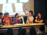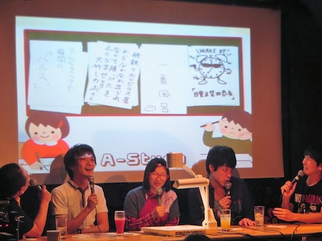 低温調理の鳥の胸肉にも惹かれたAだったが、「それはT-nationでやってください」ということで、このターンの勝者は文句なしに高佐に決定。2ターン目でも、いきなり高佐が出したイラストカード「目覚ま柴田恭兵」が、Aはもちろん、会場中に大ヒットした。