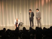 そのままいったん幕が閉じ、再びチャレンジするも、ゆっくりと引いたクロスとともにコップや皿もゆっくり落下。あらためて3度目のチャレンジへ。さすがの芸人たちも「いけ!」と声援を送るも、すーなかはクロスをぐしゃぐしゃにしてしまう。そしていきなり客席に向かって「しーっ!」と合図を送り、パンッと手を叩くと、マキシマムパーパーサム長澤がかぶっていた金色の帽子が一瞬でどこかへ。会場中に大歓声が沸き起こる中、相方・つよしの「ハゲとるやないかー!」というエコーが響いた。