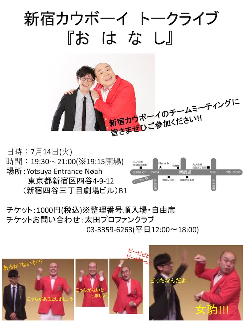 漫才師として注目を集めている新宿カウボーイが、2人だけでどんなトークを繰り広げるのか。気になる人は会場に足を運んでみよう。チケットは太田プロファンクラブにて予約受付中。
