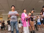 「一発屋総選挙」に立候補中のHGらが、より多くの票を獲得すべく駅前で選挙チラシを配り始めると、通行人はすぐさま彼らのもとに殺到。4人は集まってくる人たちに笑顔で挨拶し、写真撮影にも終始にこやかに対応していた。