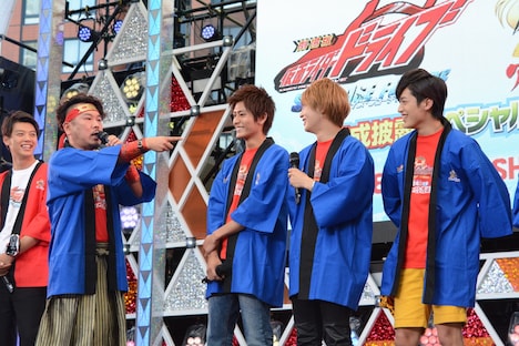 「劇場版 仮面ライダードライブ」にゲスト出演している柳沢は投げキッスをしながら登場し、撮影の際に間違えてピンクのリップクリームを塗ってしまったというエピソードを披露。さらに作中で警視庁の参事官を演じたことから、おなじみのコント「ひとり警視庁24時」を展開し、主人公・泊進ノ介役の竹内涼真を“逮捕”してみせる。現在夏の甲子園の地方予選が行われていることをふまえ、「ひとり甲子園」でも会場の笑いを誘った。