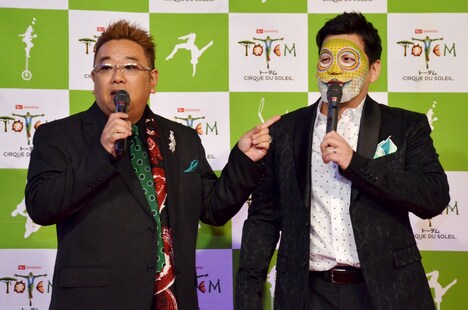 この「ダイハツ トーテム」でサンドウィッチマンがスペシャルサポーターを務めるのは既報の通り。富澤はセレモニー中、物語内のキャラクターが原型となったパックを顔に乗せながら、舞うようなポーズで取材陣にアピールを続ける。「ダイハツ トーテム」の日本公演が東京を皮切りに、大阪、名古屋、福岡、仙台で上演されることを受け、伊達は「仙台公演が楽しみ。両親を招待したい」、富澤は「北海道新幹線が開業するので北海道にも来てほしい」と語った。