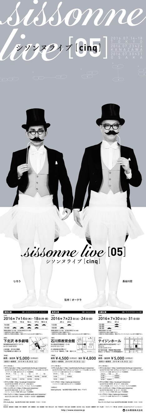 2013年12月にスタートした「シソンヌライブ」も今回で5回目。シソンヌが立ち上げ当初から目標としてきた東京・本多劇場での公演が実現する。また金沢公演と初の大阪公演も決定した。