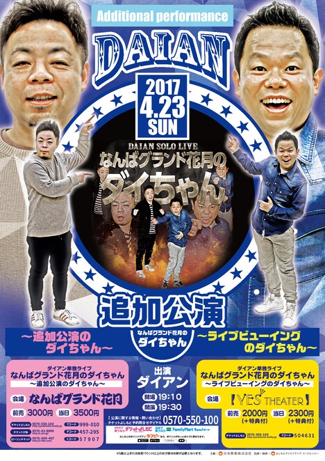 なお「追加公演のダイちゃん」「ライブビューイングのダイちゃん」共に当日券が販売される予定。チケットの販売状況はチケットよしもと、劇場窓口で確認を。