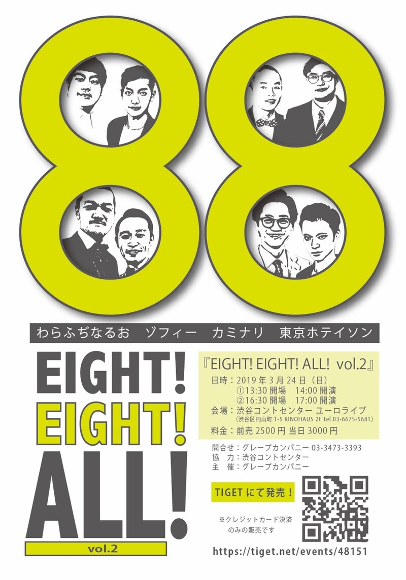 昨年2月に初開催された「EIGHT! EIGHT! ALL!」はグレープカンパニー期待の若手4組が新ネタやユニットコントを披露するライブ。前回は事務所の先輩であるサンドウィッチマン伊達がメンバーにも内緒でサプライズ登場し、コーナーを盛り上げた。