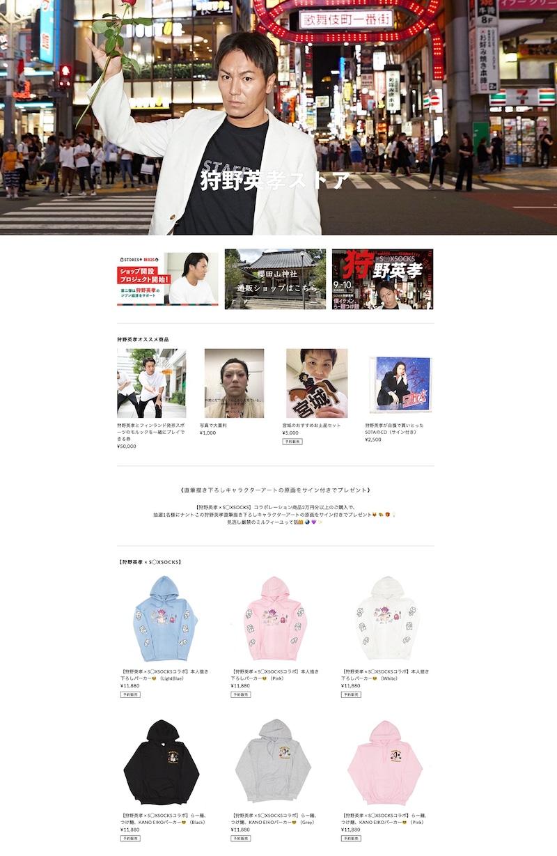 同ショップでは、狩野とアパレルブランド・S◯XSOCKSのコラボグッズ「本人描き下ろしパーカー」「らー麺、つけ麺、KANO EIKOパーカー」「STAFFゥTシャツ」などが販売されている。また狩野がチョイスした「宮城のおすすめお土産セット」、指定した写真に狩野が一言添えて動画で返信する「写真で大喜利」といった商品も。ファンはぜひチェックしよう。