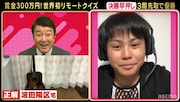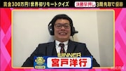 家にいながら賞金200万円を獲得した宮戸は「200万ですら僕の人生では持ったことない大金です。ありがとうございます!」と喜びを語る。これを聞いた加藤は「そうね。300万円持って帰るより、100万円獲らないで帰ったほうが今後ABEMAの仕事増えるから大丈夫だよ!」と言葉をかけて出演者の笑いを誘った。