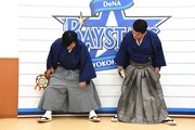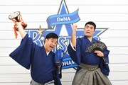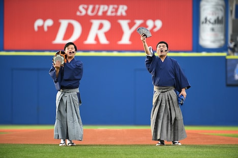 横浜DeNAベイスターズが神奈川・横浜スタジアムで展開する日本生命セ・パ交流戦「交流戦 SERIES 2021」の応援隊長に就任したすゑひろがりず。本日はスターティングメンバー発表を担当したあと、試合開始に向けたセレモニアルピッチでチームを盛り上げた。