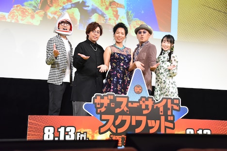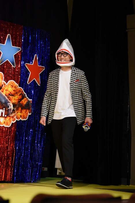 こがけんはファン代表として劇中に登場するキャラクター、キング・シャークの被りものを着用し、吹替キャストの