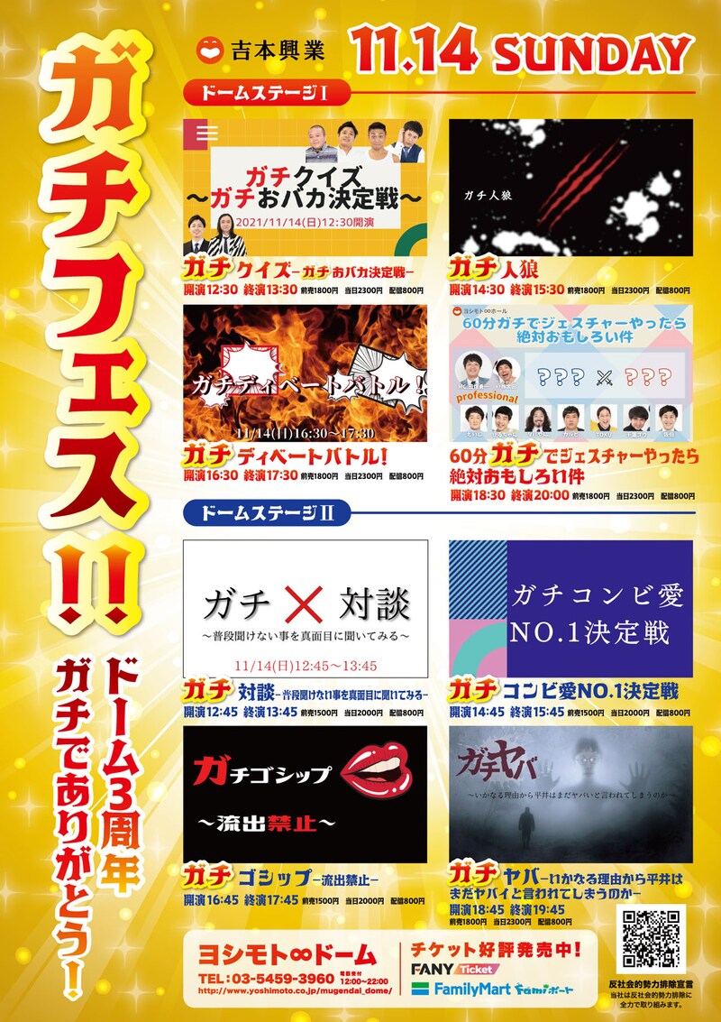 東京・ヨシモト∞ドームの3周年を記念し、11月14日(日)に「ガチフェス!!ドーム3周年ガチでありがとう」が開催される。