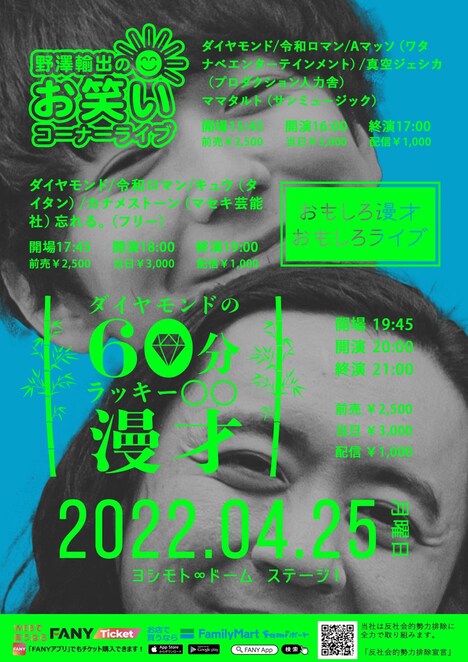 なおダイヤモンドは4月25日(月)に東京・ヨシモト∞ドーム ステージIで「ダイヤモンドフェス」を実施。「野澤輸出のお笑いコーナーライブ」「おもしろ漫才おもしろライブ」「ダイヤモンドの60分ラッキー○○漫才」の3公演を行うほか、ステージIIには来場者用の休憩所とダイヤモンドのパネルと写真が撮れるフォトスポットを設ける予定。