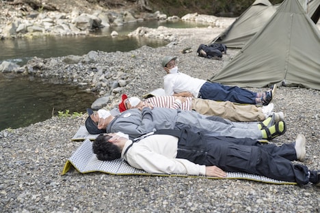 基地を作る川沿いのポイントに一同を案内した江凸崎は「いいところでしょ!」と胸を張るが、おぎやはぎ小木からは「ここを選んだのは村田だからお前は関係ないだろ!」とツッコミが。江凸崎やそれでもめげず、キャンプインストラクターの資格を生かしたアウトドアテクニックを披露していく。