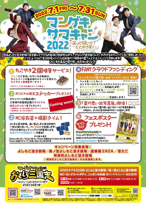 またこの2会場を含む関連施設にて「マンゲキサマキャン2022~笑って騒いでととのう夏~」と題したキャンペーンも。夏フェスに関するクラウドファンディング企画のほか、夏の思い出写真展、MC芸人の浴衣着用&写真撮影タイムの設置などが予定されている。詳しくはよしもと漫才劇場のオフィシャルサイトで確認を。