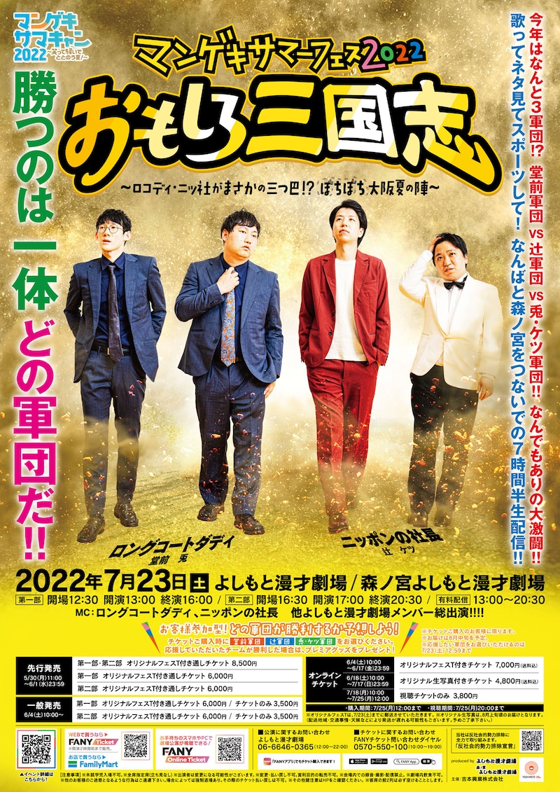 大阪・よしもと漫才劇場と森ノ宮よしもと漫才劇場が7月23日(土)、「マンゲキサマーフェス2022 おもしろ三国志~ロコディ・ニッ社がまさかの三つ巴!?ぼちぼち大阪夏の陣~」を開催する。