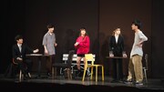 8人がずらりと横一列に着席したまま、次から次へと繰り出す会話の可笑しさで観客を引き込んでいくコント「浪人」を皮切りに、6本のコントを立て続けに披露。男1人女2人のグループの長年にわたる友人関係が知人の干渉によって突然音を立てて崩れていくさまを熱演した「今更」、職業紹介所に勤務する新人スタッフが休憩時間を使って自分の職探しに窓口を訪ね、留まる可能性も含みながらも友人とバーベキューに行こうとして上司を揺さぶる「転職」、浮気相手とはち合わせた男女とその周りの人物たちが素早く鮮やかな変わり身で危機を回避していく「即興」など、どのネタにも見る人の心をくすぐるたくさんのポイントが。始まりから終わりまで、はつらつとしたキャラクターたちによる味わい豊かなコントが満席の会場に心地よい笑いを充満させた。