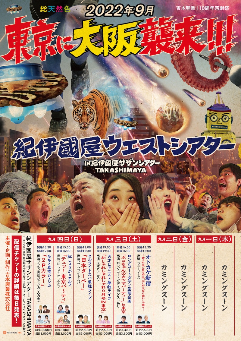 9月1日(木)から4日(日)までの4日間、「紀伊國屋ウエストシアター」と題して大阪・よしもと漫才劇場の芸人たちによる10公演が東京・紀伊國屋サザンシアターTAKASHIMAYAにて開催される。