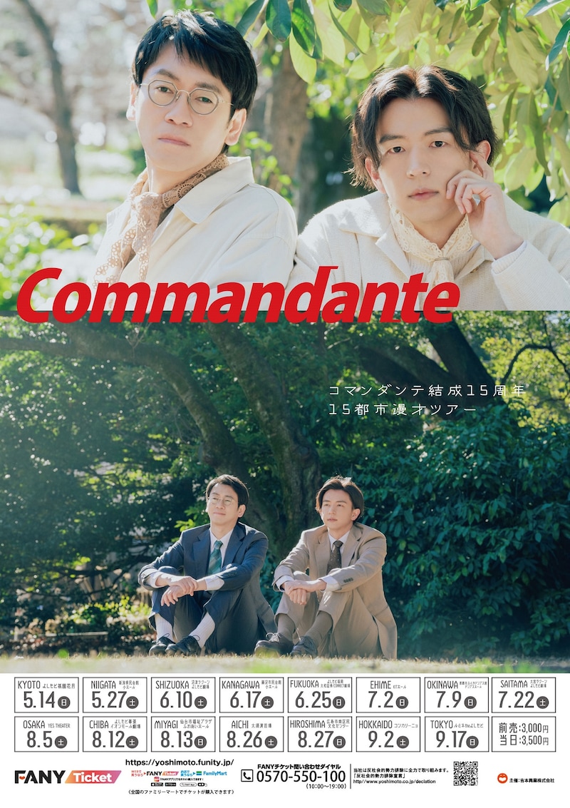 これはコマンダンテが結成15周年を記念し、京都、新潟、静岡、神奈川、福岡、愛媛、沖縄、埼玉、大阪、千葉、宮城、愛知、広島、北海道、東京の15都市を巡るツアー。石井は「それぞれ現地集合でお願いします! 岩盤浴に行くくらいの気持ちで来てください!」、安田は「まだまだユニフォームを汚しながら泥臭く進みたいと思います! 会場でお待ちしてます!」とコメントした。チケットは、FANYチケットで明日3月25(土)11:00に先行販売がスタートし、4月8日(土)に一般発売される。