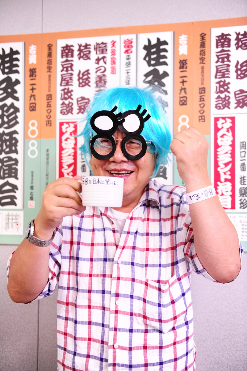 登場した文珍は、青緑のウィッグを付けたレディー・ガガスタイル。リストバンドをつけ、コーヒーカップを持ち、公演日にちなみ88が付いたメガネを用意するなど、大御所とは思えないほど茶目っ気たっぷりな姿に会場も大爆笑だった。