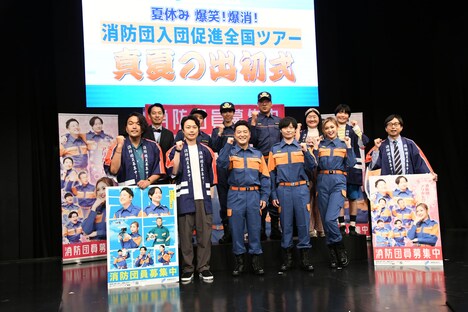 「夏休み 爆笑!爆消!消防団入団促進全国ツアー 真夏の出初式」と題した記者会見が本日7月13日に東京・ヨシモト∞ホールで実施された。総務省消防庁が展開する「消防団入団促進キャンペーン」のサポーターを2021年12月から務めている