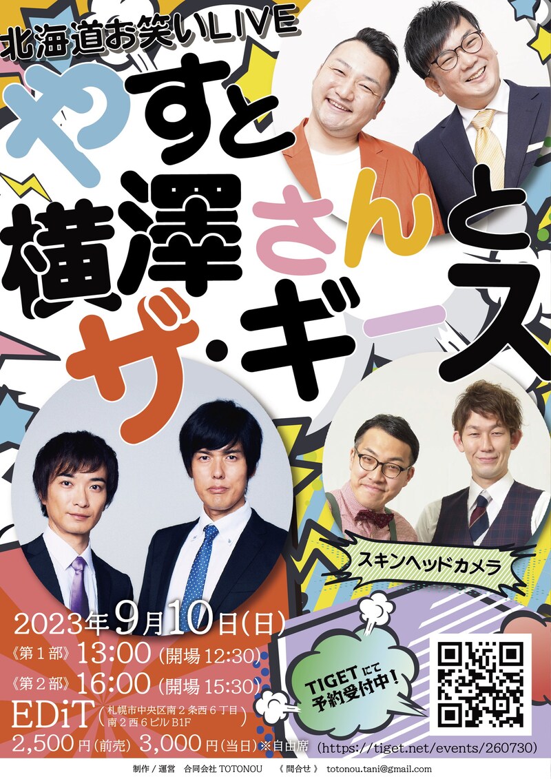 「やすと横澤さんとザ・ギース」と題したライブが来月9月10日(日)に北海道・EDiTで開催される。
