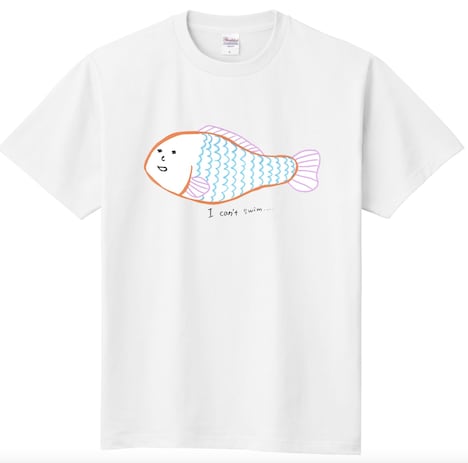 心を無にしてペンを握っているとフッと降りてきました。老若男女問わず着られるものを意識しました。色使いにこだわりました。さらに添えた一言が着ている人のセンスを感じさせます。I can’t swimは苦手なことがあっても堂々としましょうという意味を込めました。