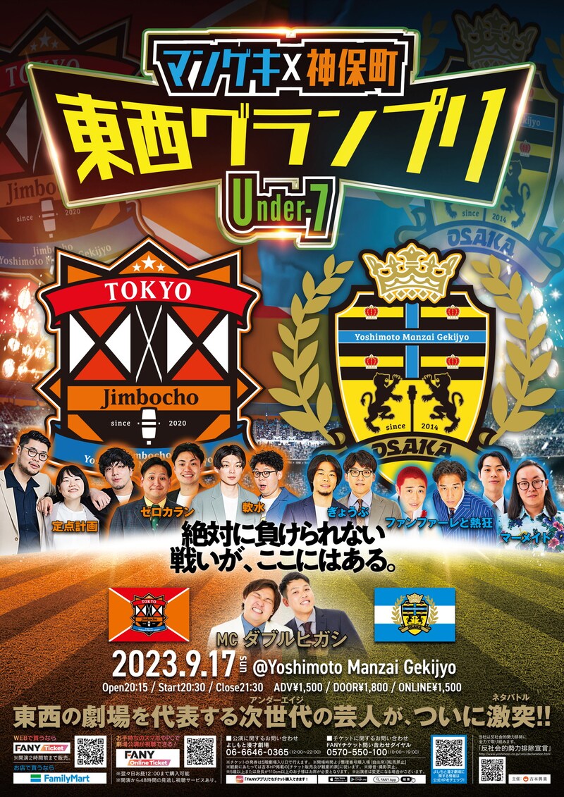 バトルライブ「マンゲキ×神保町 東西グランプリ ~Under-7~」が9月17日(日)に大阪・よしもと漫才劇場で開催され、有料配信も行われる。