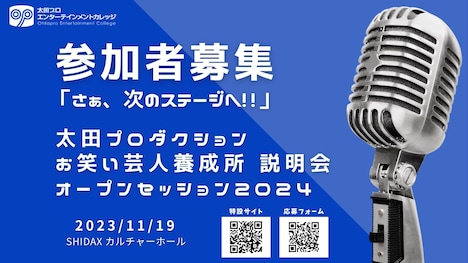 これは数々の芸人を輩出する太田プロの創立60周年を記念した初のオープンセッション。スクール運営スタッフのOECに関する説明や、芸人コース講師による「芸人コースの講義・特徴」などの説明が行われる予定だ。参加料は無料だが、2024年4月の入学に向けてお笑い養成所や芸能育成スクールを探している15歳以上が対象。募集期間は11月12日(日)まで。詳細はオフィシャルサイトで確認を。